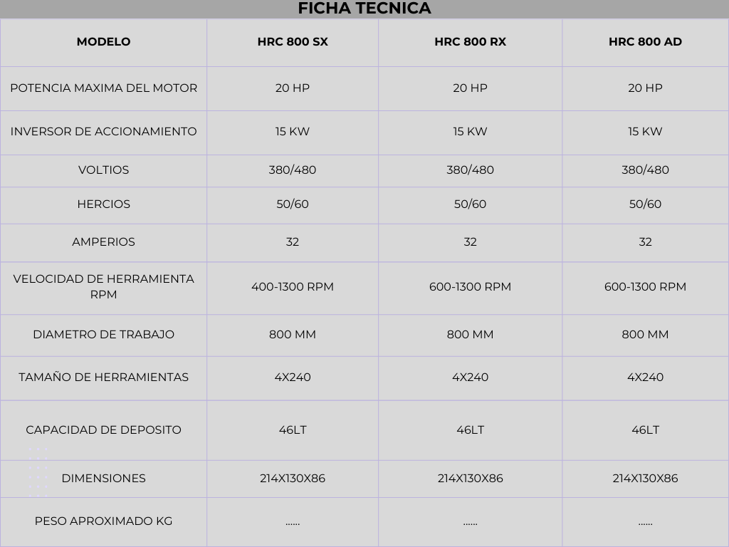 PRINCIPALES CARACTERÍSTICAS DE HRC 800 SX/RX/AD