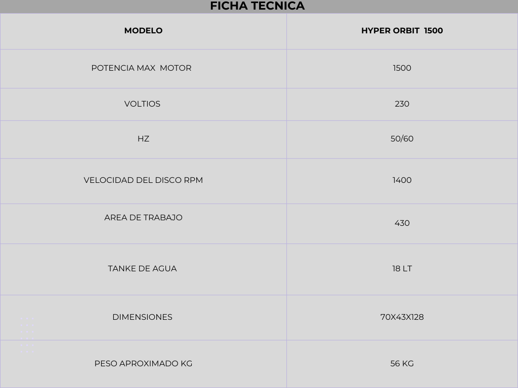 Al explotar el principio roto-orbital con oscilaciones de alta frecuencia, Hyper Orbit sorprende por su excelente estabilidad y maniobrabilidad, incluso las operaciones de cristalización con lana de acero serán rápidas, fáciles y sin esfuerzo. El sistema de liberación rápida del cabezal y el marco compacto la convierten en una máquina fácil de transportar pero robusta y resistente.