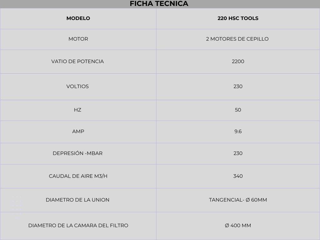 HYPERVAK 220 HSC TOOLS ES EL COMPAÑERO IDEAL PARA TODOS LOS PROFESIONALES QUE NECESITAN UN EXCELENTE RENDIMIENTO DE SUCCIÓN Y UNA EXCELENTE CAPACIDAD DE FILTRACIÓN.
