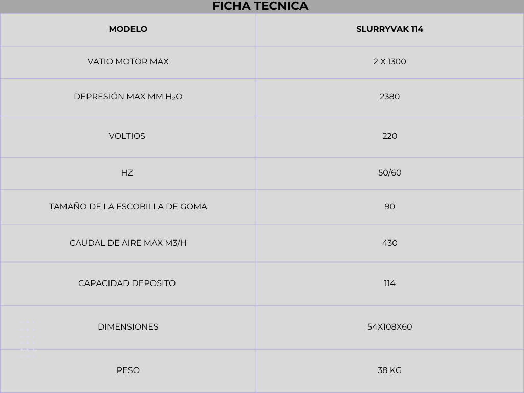 Las características del aspirador son 114 litros de capacidad. Vástago basculante. Ideal para recoger lodos de lijado. Robustez y durabilidad. Dos motores independientes. Cepillo de goma giratorio 360°. Escobilla de goma Palanca de elevación. Doble protección de seguridad para los motores.